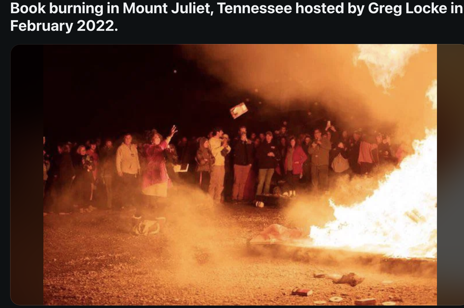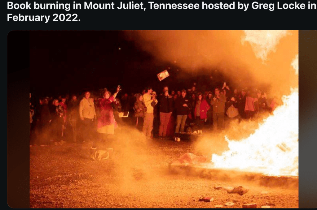 Book Burning in Tennessee- 2022. “According to Tyler Salinas, a photographer who was present at the bonfire, there was one counter-protester, who held up copies of Fahrenheit 451 and On the Origin of Species, and threw a book into the fire that he said was the Bible.”