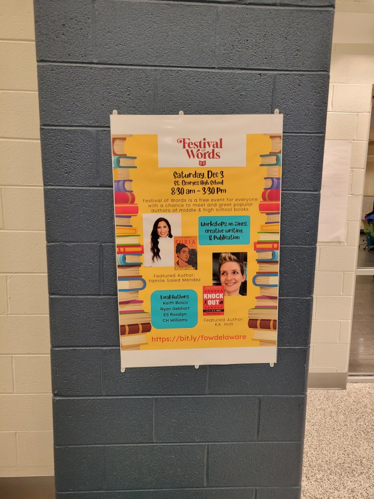Such was the mantra you would see occurring at the December 3rd Festival of Words held at St. Georges Technical High School in Middletown in Middletown, Delaware. Despite the chilly onset of a rainy morning to greet all 60+ registered attendees, the glow of literary excitement was in every corner of the halls as you entered. Authors, artists, students, librarians, and faculty all became intertwined in the excitement of a reading free for all that represented the return of Festival of Words through the hiatus that COVID had brought to many literary events.