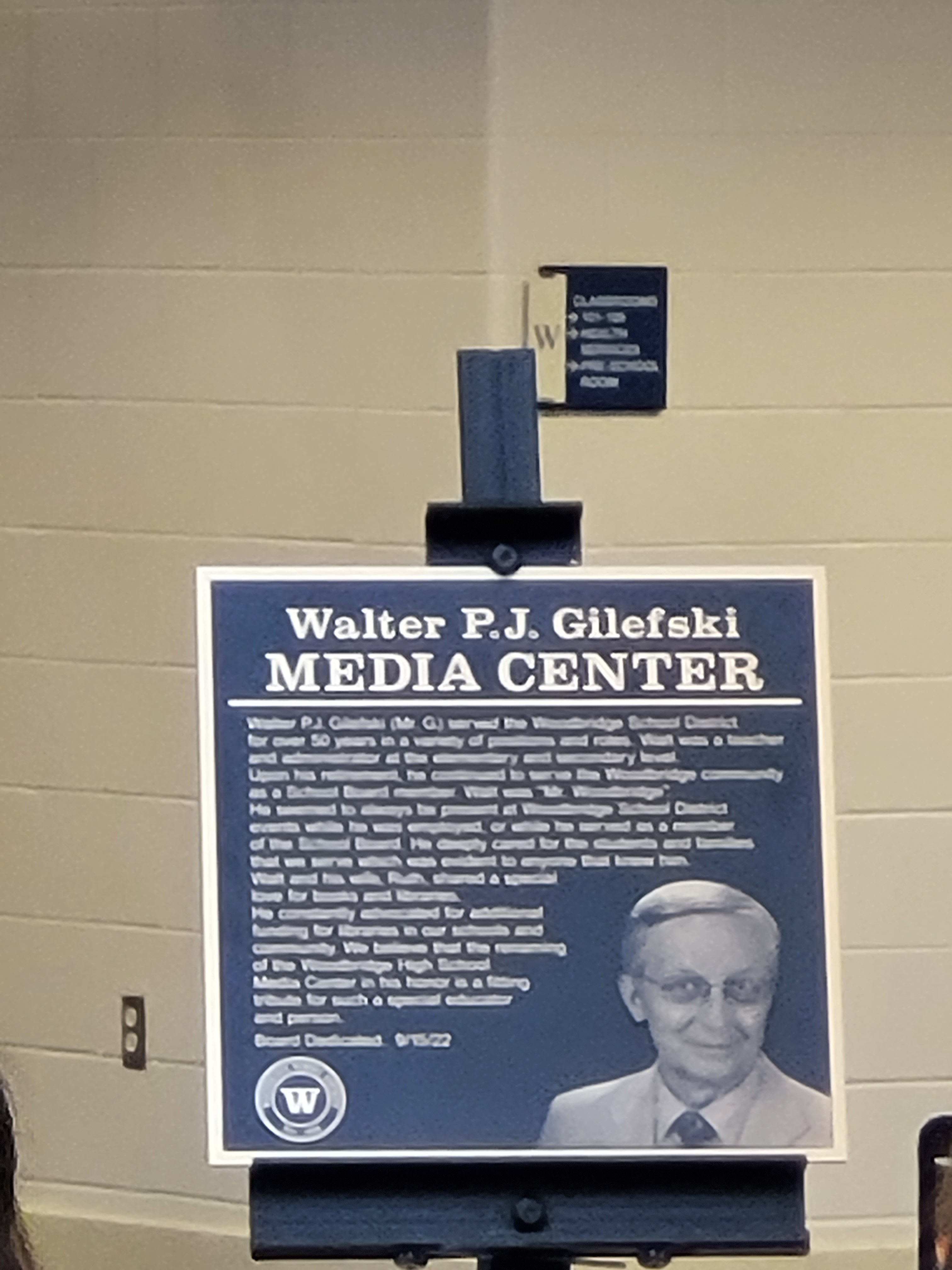 On Wednesday, April 26th, the Woodbridge Library Media Center, the Woodbridge Library, or sometimes even referred to as the Raider’s Den, received an upgrade in title now known as the Walter P.J. Gilefski Media Center.