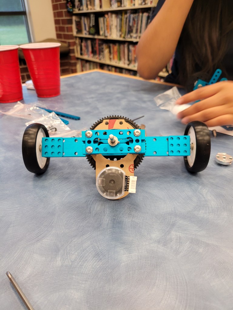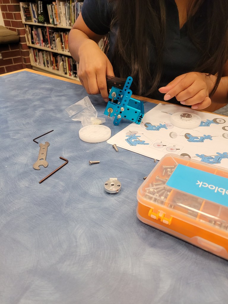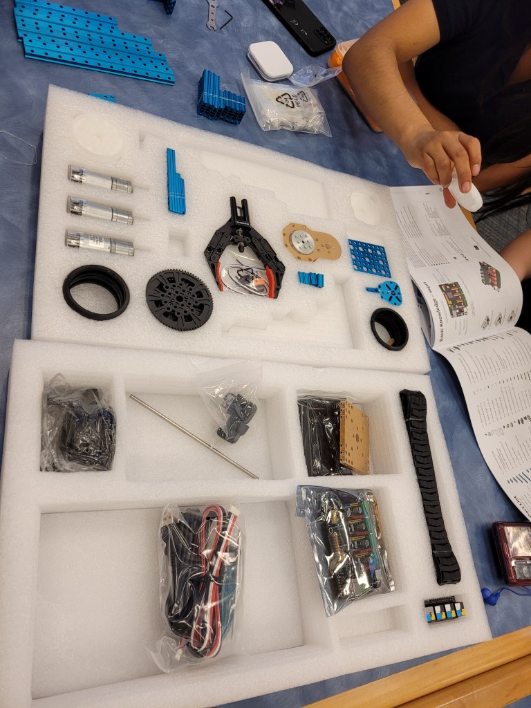 “Mom, I need 30 minutes more, we are getting done…!” Here we are in the Walter P.J. Gilefski Media Center at Woodbridge, three members of the Girls Who Code Club, robotic parts we never even spied before all tumbling out of the box,