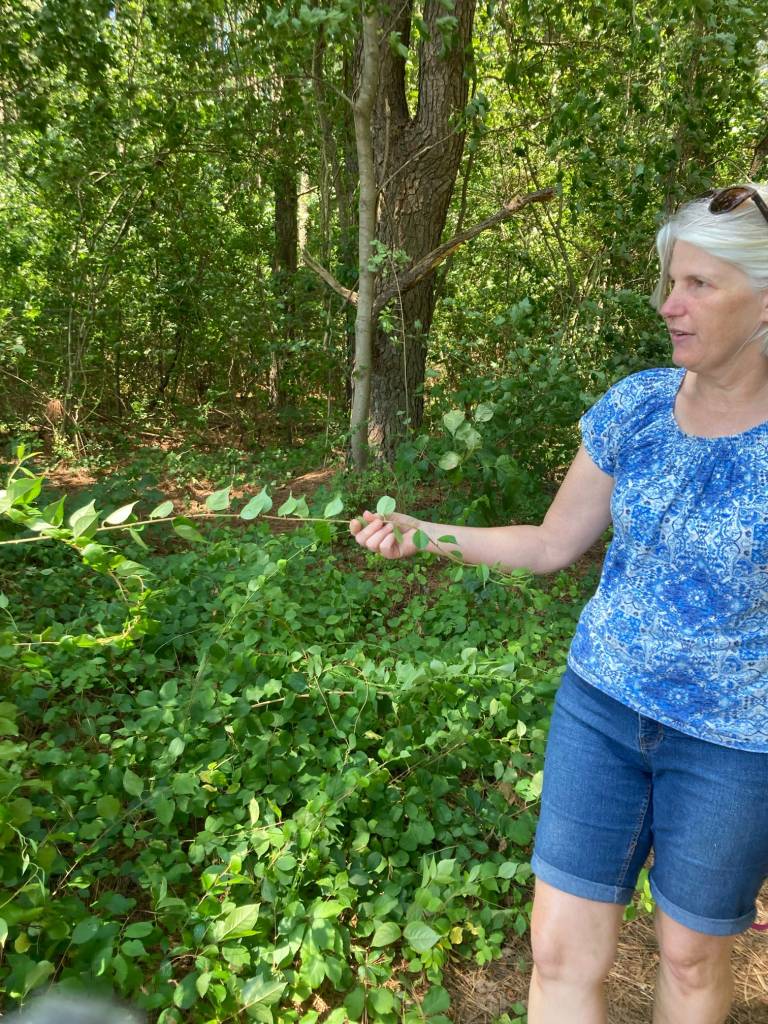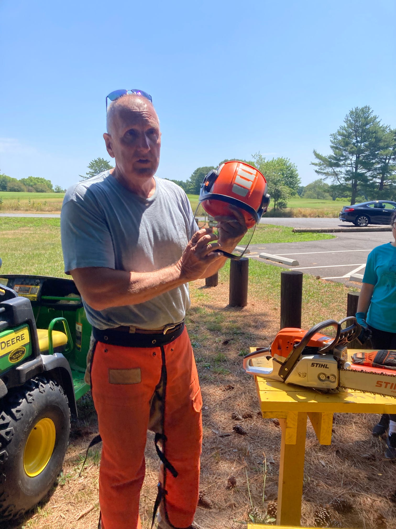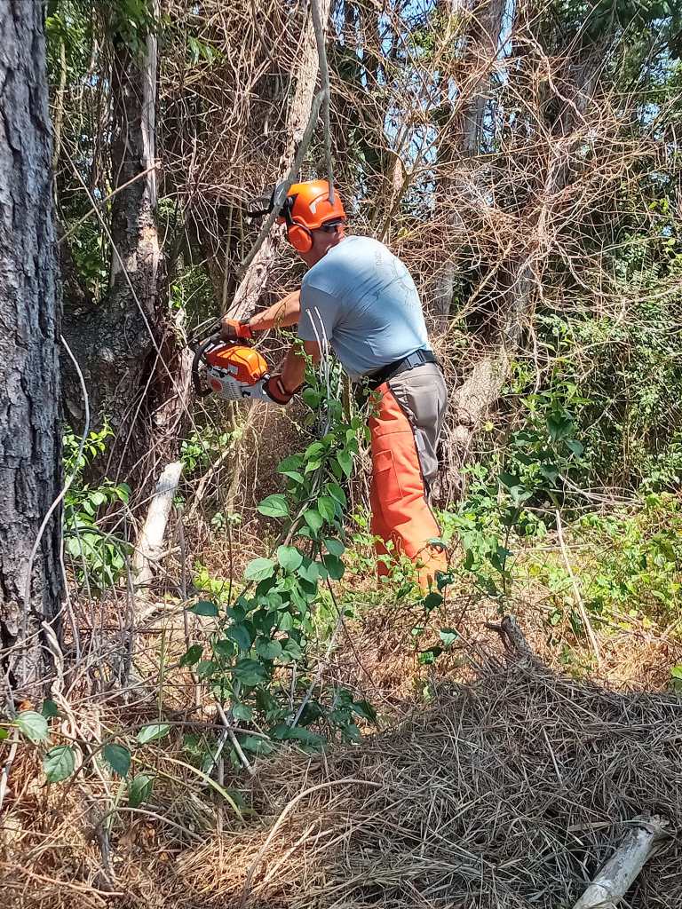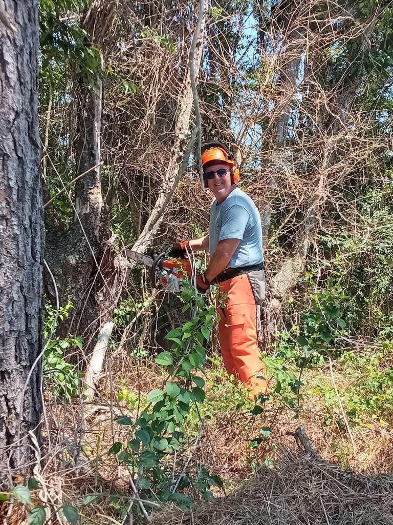As part of the effort to keep bringing in additional experts in the field for the NRWC students, board members Holly and Gary Focht visited the trail and taught and showed the impacts of invasive and native species for our environment. Additionally, Mr. Gary Focht showed all work study members how to properly use a chain saw and the dangers of doing so – and the precautions to take as a result of them. There were trees in the way of a sign on the turn and with the proper trimming and now, visible as it should be!