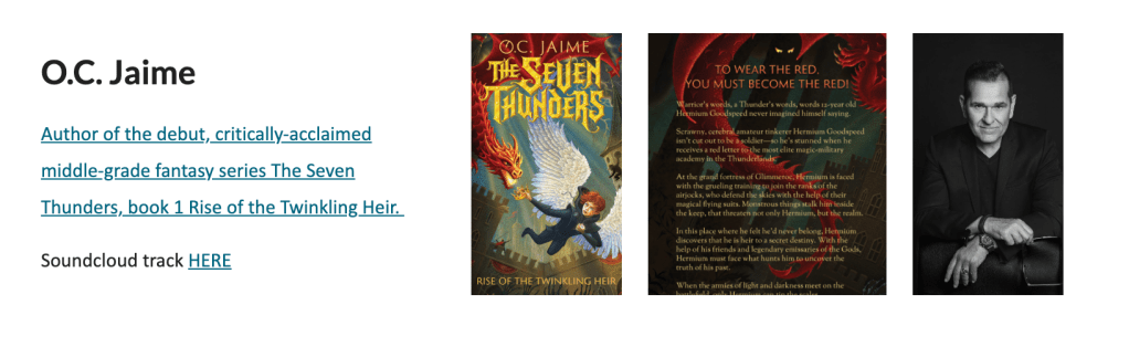 We are SO excited about the author experience O.C. Jamie is bringing to Festival of Words. Attendees will be able to delve into O.C. Jaime’s world all morning – you will NOT want to miss this.