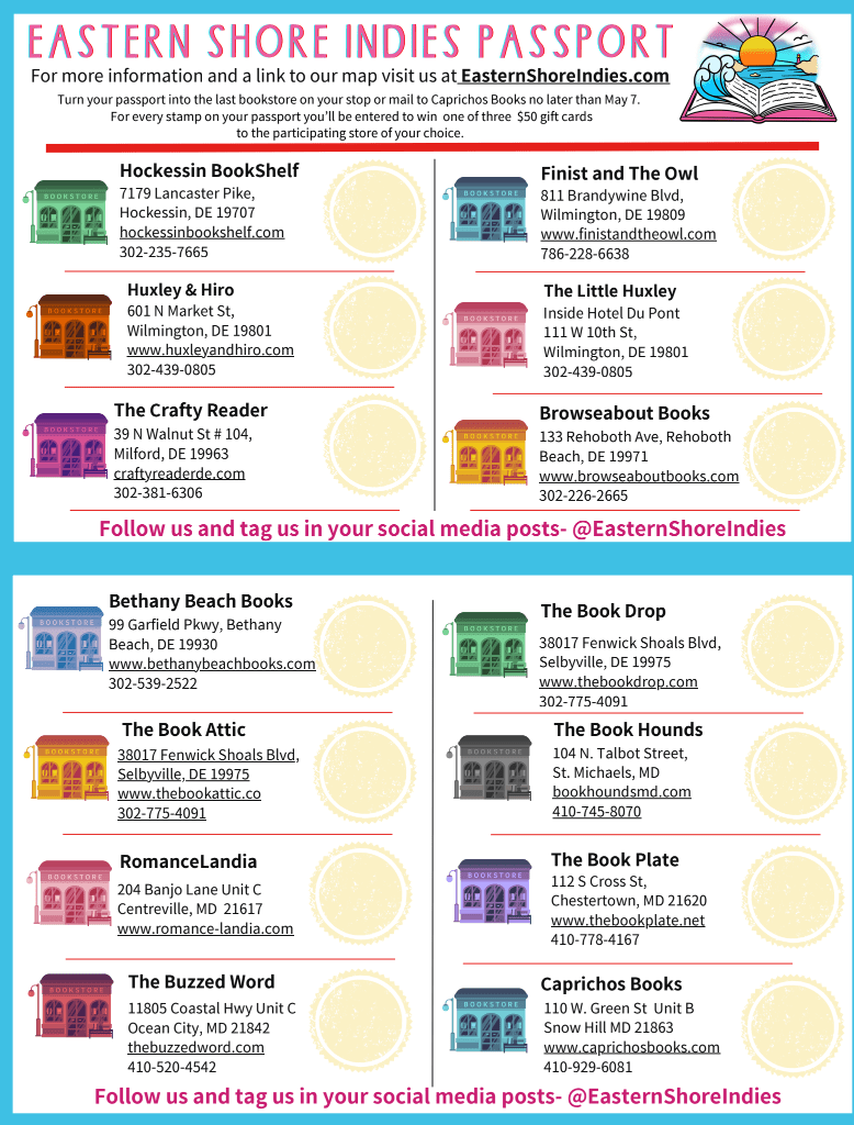Turn your passport into the last bookstore (Visit as many bookstores as possible on your stop or mail to Caprichos Books no later than May 7.