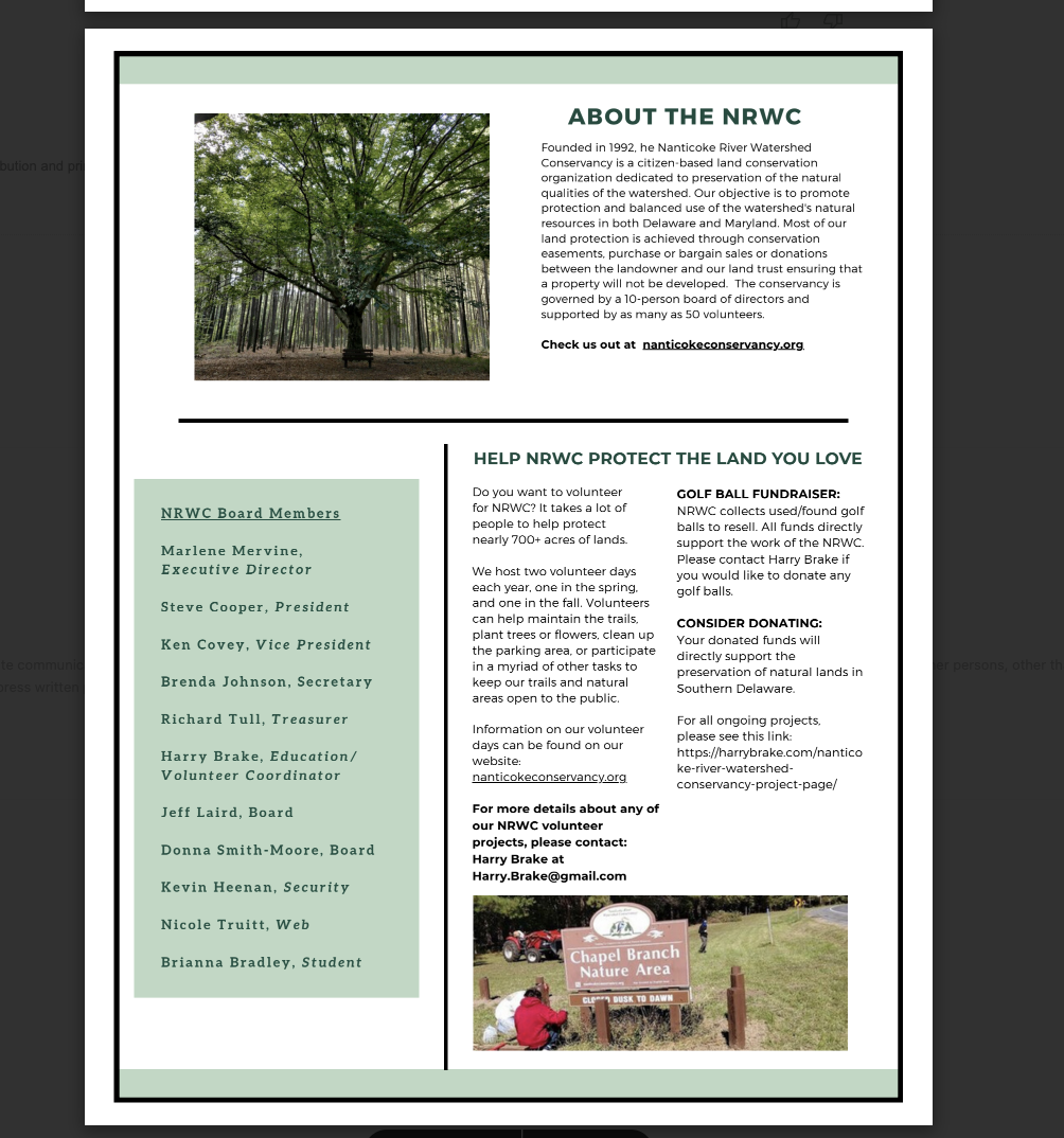 and I hope you will use the template to encourage senators/representatives/ members of the Sussex County Council to help support the NRWC in creating and establishing an office, as well as a established parking lot, gazebo learning area, etc at Chapel Branch to start. If we can affirm how often this is used and how many people – and the need, and get into a regular budget – the lands we acquire can meet with the education on those lands we can provide to our community! Your voice will carry a ton of weight. The template you can edit is HERE (The links in the letter are built into the letter on Google already!)