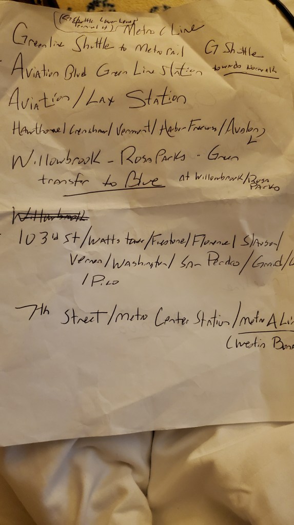 Checked bag came down the chute within half an hour, I asked an attendant where to catch the metro to the Green line ($7.80 by metro, $95.00 to $120.00 by taxi/Uber, etc, I was all about the metro!) – found the airport shuttle from LAX to what would be a destination to Willowbrook/RosaPark, ending the Green line, transfer to Blue Line, end at 7th Street/Metro Center-bam a BING! – and the hotel area and tour pickup, a 6 minute walk- hmmmm, this seems tooooo easy?