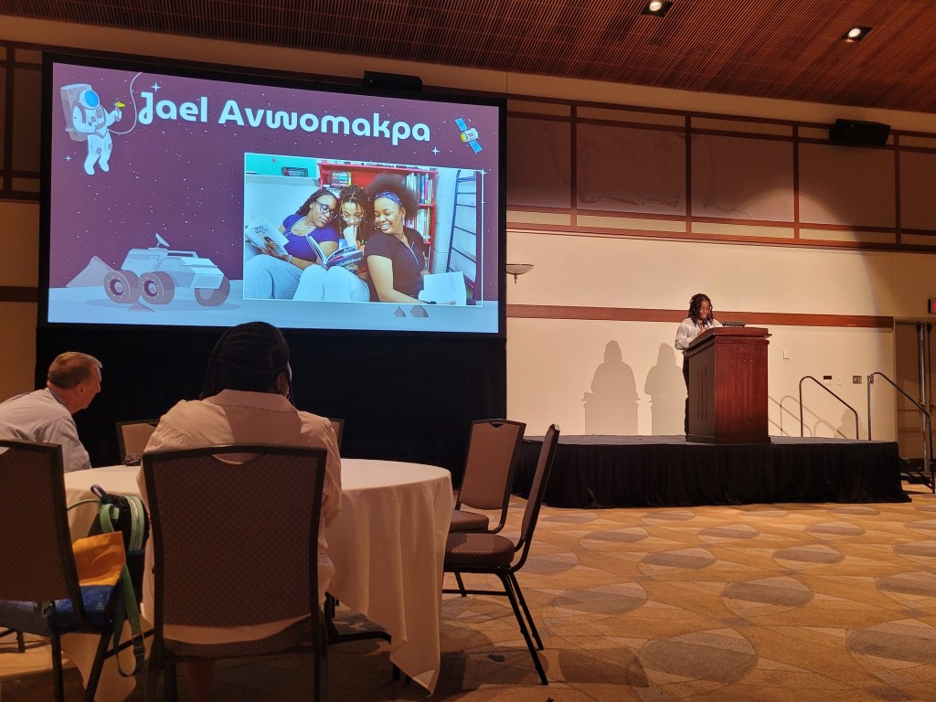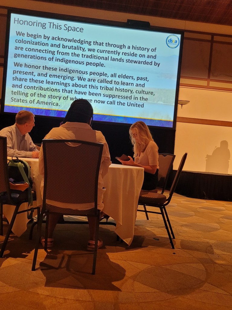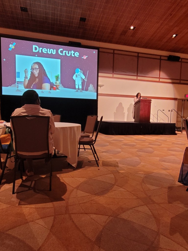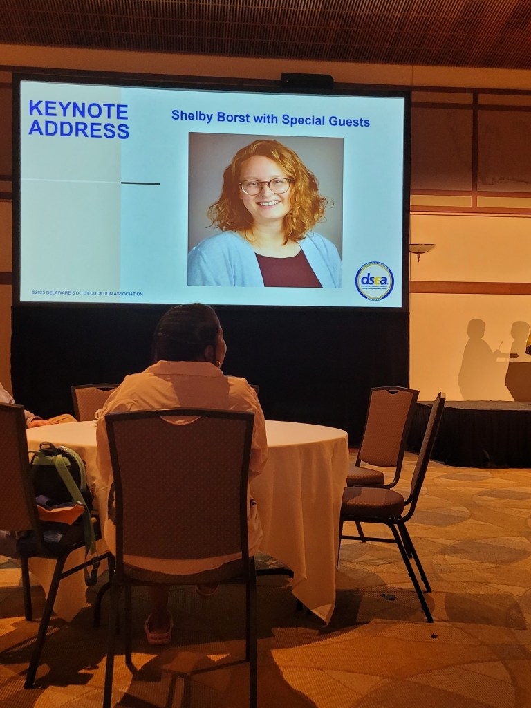 Hearing President Stephanie Ingram reinforce the need for us to grow stronger, better, and have more foresight as educators fell in line with what we all felt we were feeling with the tumultuous path we are setting on in the present day. I felt very at ease and no nervousness as I made it in the nick of time to snag breakfast, and settled down to friendly conversation with attending members. When the Delaware State teacher of the Year, Shelby Borst came to the stage. I liked her stories of collaboration and teamwork with her experience at NASA Space Camp and then, she shared the stage to have two of her students also be part of the key note. I LOVED THIS!
