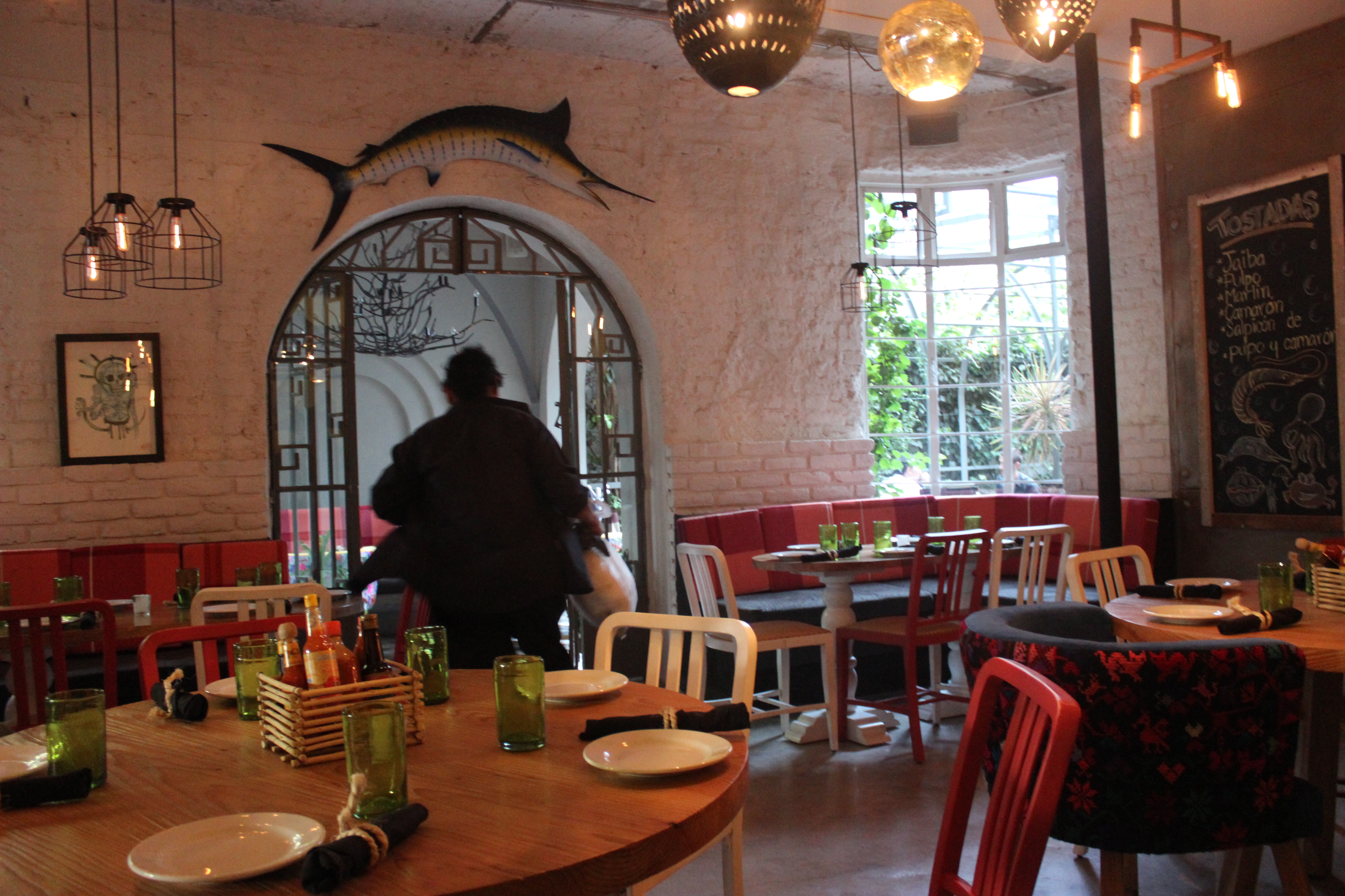 THREE – Yes it is dark inside but – it works, it felt comfortable despite bright huge windows, (and there are two cool openings looking out onto Tabasco) and it was no big deal, dark but seemed to fit perfectly.