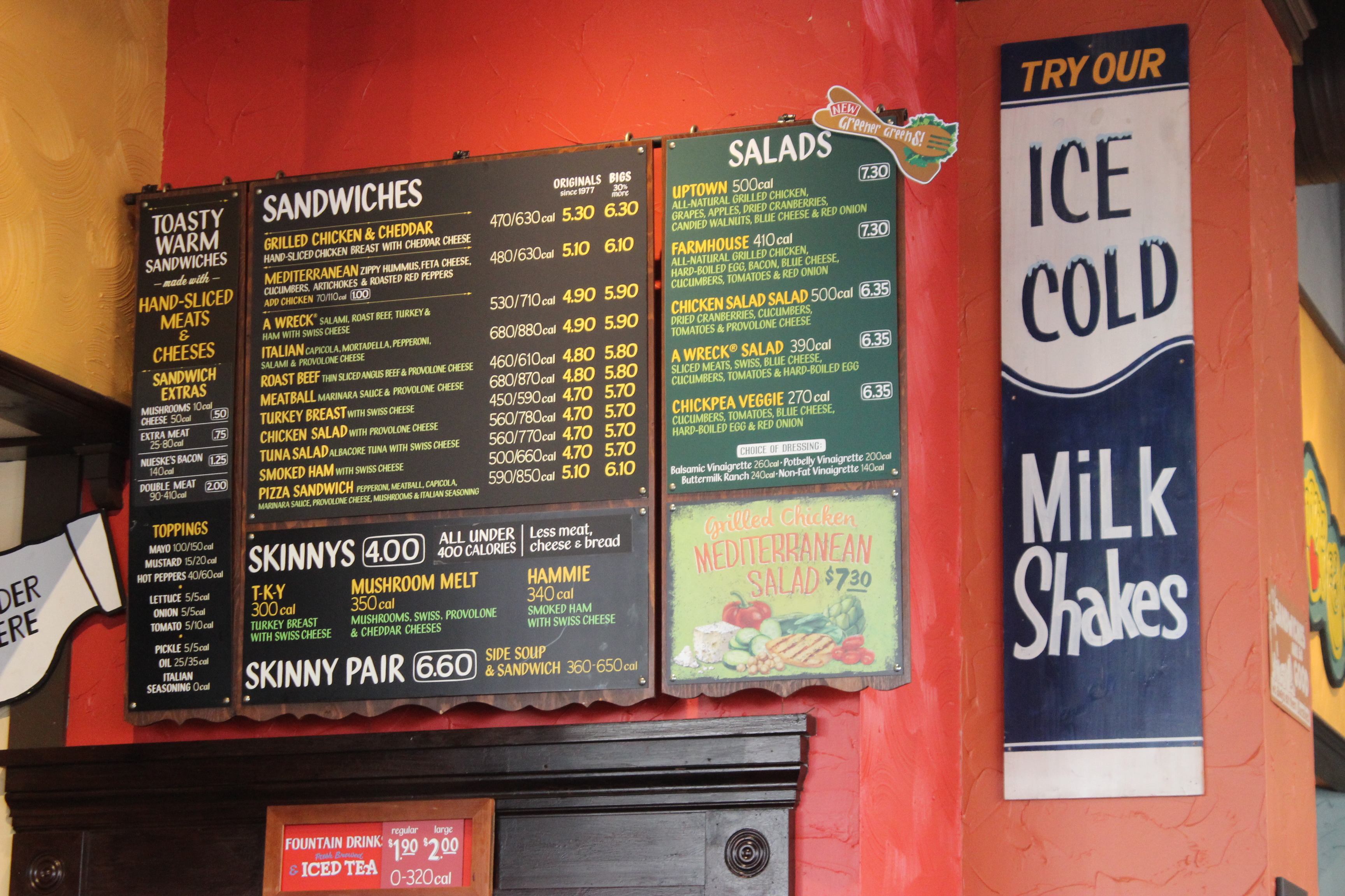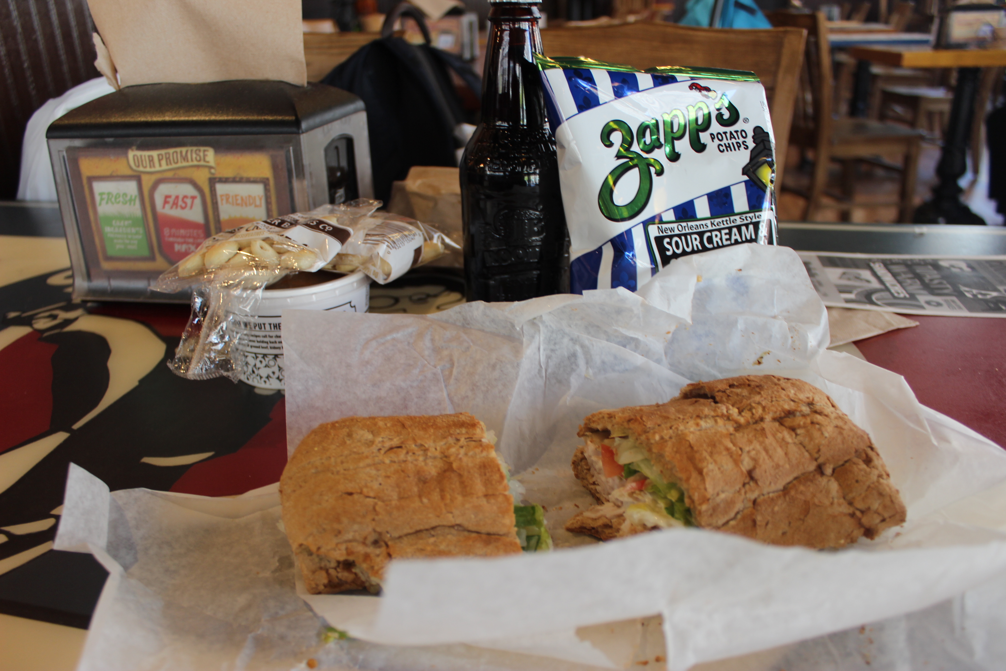 El pan servido con su comida es excelente y las bebidas son tanta una variedad de sana a plainold agua mineral, pero iot es todo fresco y acogedor! Además, el sandwich proviene de lavariedad más fresca! 12 alternativas y la elección de dos con su sandwich! Además, losasientos de la acera es perfecto para aquellos que tienen perros y aquellos que sólo quierendisfrutar del parque cercano. La elección de los postres son anchas y mi elección de un browniefue como en casa hizo, yo podía olerlo sentado atrás en mi asiento, una vez más delicioso!Esto se funde en su mordedura de boca después de morder!